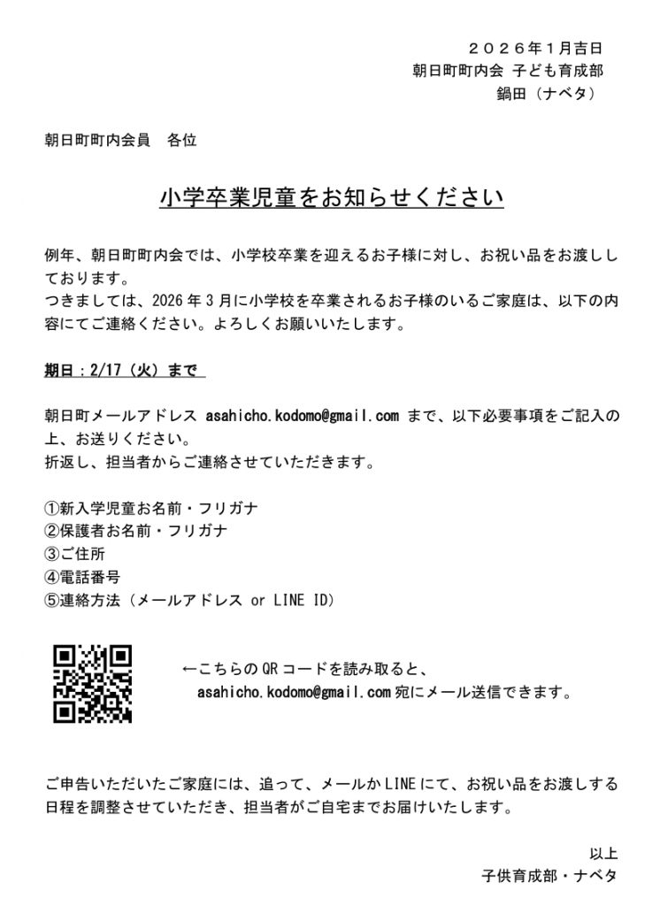 【こども育成部】小学卒業児童をお知らせ下さい